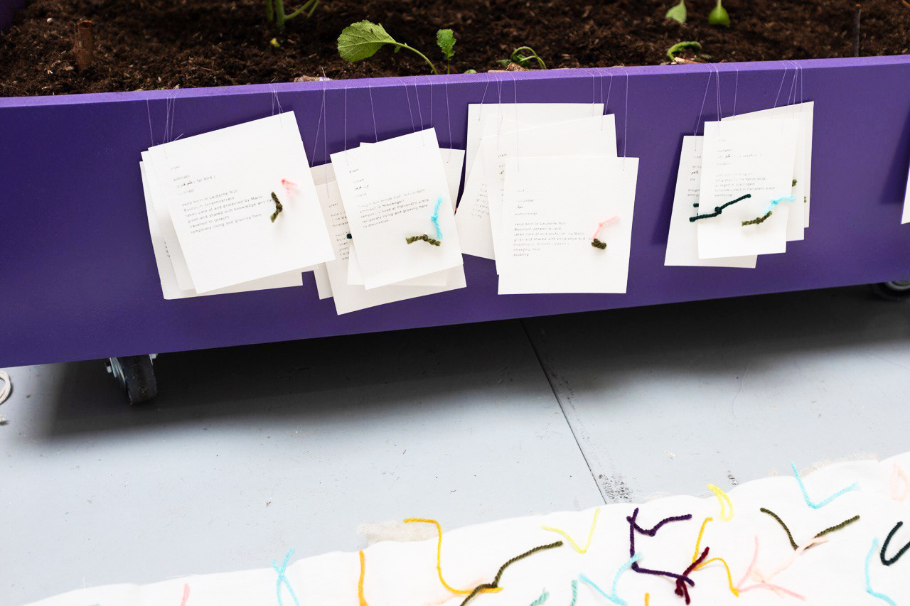 we collected small eatable plants and seeds from friends and farmers at Utrecht and Leidsche Rijn ( Utrecht ) . created pots and places for the seeds and plants to grow . and we took care of them from opening to the closing of the exhibition ( about 6 weeks ) . to make reflections on our own processes of taking care for ourselves and each other .
